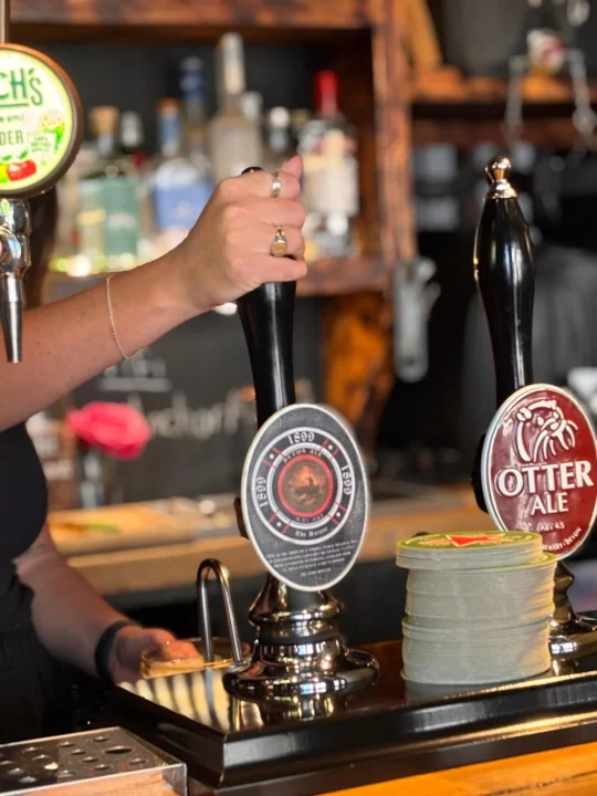 Inside, you’ll find a classic pub layout with a real log fire that’s a welcome sight for walkers returning from Watersmeet. The bar is a hit with real ale enthusiasts, frequently serving well-kept local brews from across Devon and Somerset.